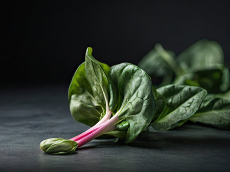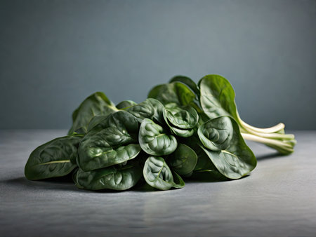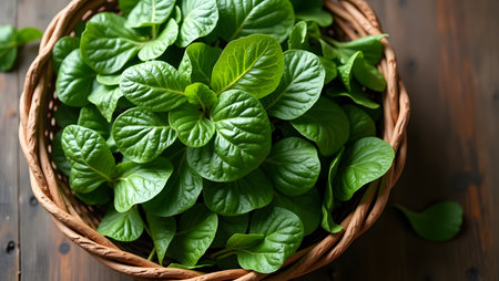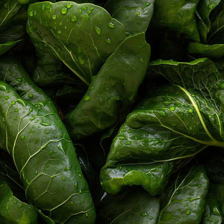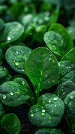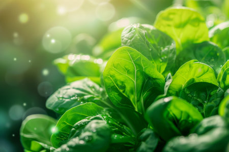 This image showcases vibrant spinach leaves freshly harvested, glistening with dew in natural sunlight. Perfect for health and culinary themes.