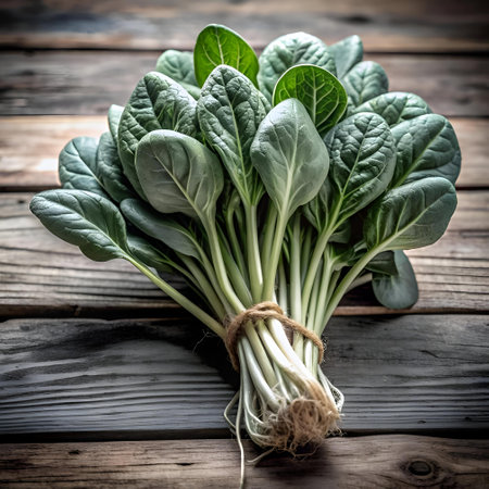 A vibrant bunch of Okinawan spinach. tied with twine and resting on a rustic wooden table. Perfect for showcasing healthy eating. Asian cuisine. or fresh produce.