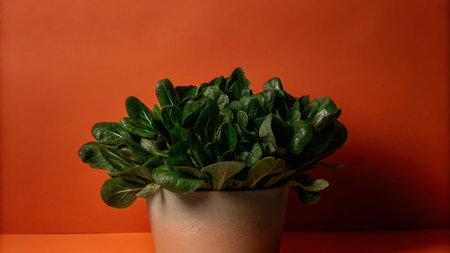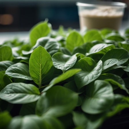 Close-up view of a fresh green leafy plant showcasing dew drops on its leaves. The vibrant colors and textures evoke a sense of nature's beauty and vitality.