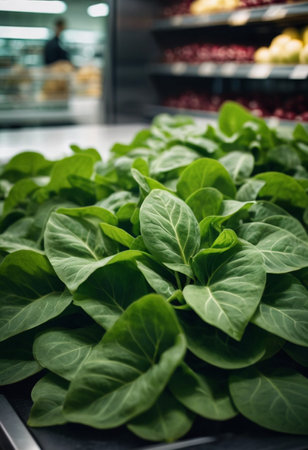 A vibrant selection of fresh sorrel leaves is beautifully arranged on a supermarket counter, inviting shoppers to explore their culinary potential for enriching autumn meals. Generative AI.