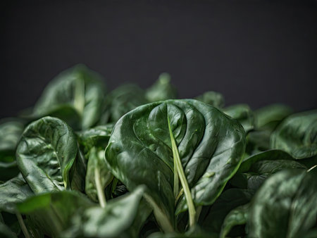 Fresh spinach leaves on black background. Healthy eating concept. Selective focus.