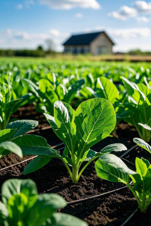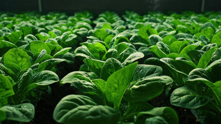 Sprouting spinach field under a clear sky. Generative ai. High quality illustration