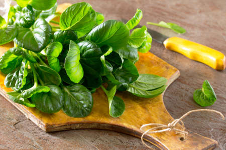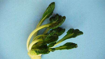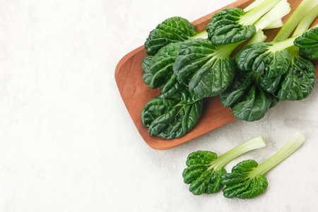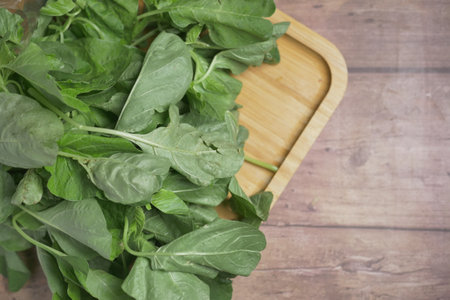 Sawi Pagoda (Tatsoi) served on wooden plate, food ingredient