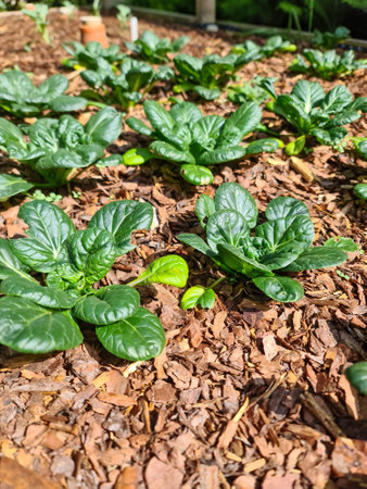 Bok choy plants thriving in a garden bed covered with wood chips, demonstrating sustainable gardening practices