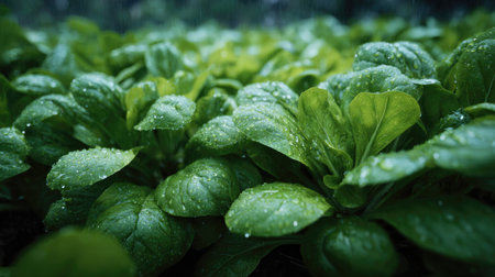 A panoramic wide view of Lamb s lettuce field growing closely together under light drizzle soft raindrops on leaves ultra realistic photography natural daylight cinematic wide composition lifelike natural scene