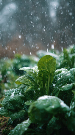 First snow falling gently on Spinach, a few snowflakes drifting slowly and settling on the leaves; fresh air, natural.
