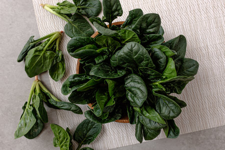 fresh green spinach leaves on wooden board close-up, healthy eating concept