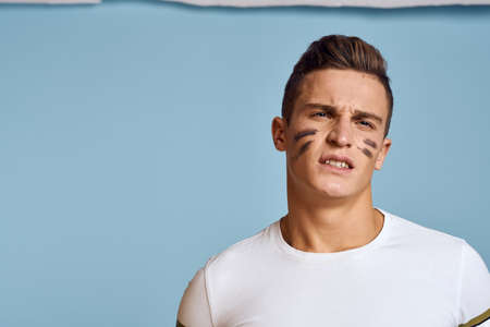 baseball guy with a bat in his hand on a blue background and a combat color on his face makeup model t-shirt
