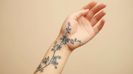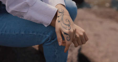 Trendy tattoo on girl s hand symbolizing freedom, rebellion, and uniqueness on beige banner.