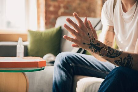 Disinfecting. Man studying at home during online courses, smart school. Getting classes or profession while isolated, quarantine against coronavirus spreading. Using laptop, smartphone, headphones.