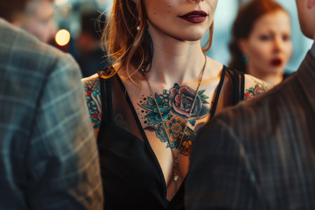 This striking close-up captures the intricate tattoos of a man adorned with a unique necklace. The image emphasizes the artistry of body ink and personal style, showcasing individuality in a lively setting.