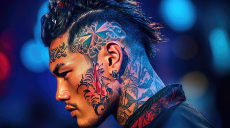 Captivating side profile of a man showcasing vivid tattoos and a stylish haircut, embodying modern urban culture and personal expression through intricate body art.