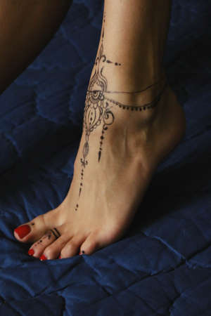 Close-up of female legs with henna tattoo on the feet on a blue background. Gently feminine graceful decoration, respect for a woman, love and take care of yourself.