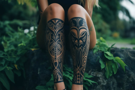 Woman sitting peacefully in nature, displaying intricate Maori inspired tattoos on her legs, surrounded by lush greenery and rocks