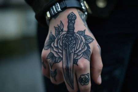 Close up view highlighting an intricate tattoo of a dagger piercing a rose, beautifully detailed on the back of a hand