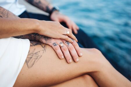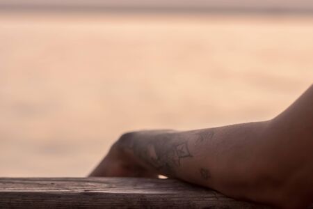 a good looking partial closeup shoot to tattooed girl arm - blurry sea as background. photo has taken at izmir/turkey.