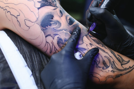 A professional tattoo artist introduces black ink into the skin using a needle from a tattoo machine.