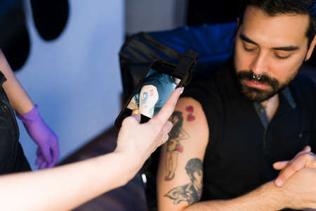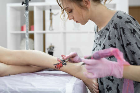 Tattoo specialist shows the process of tattooing studio