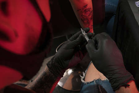 Hands of tattoo artist in black gloves busy with work at tattoo shop.