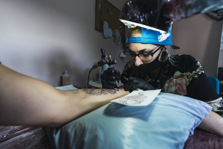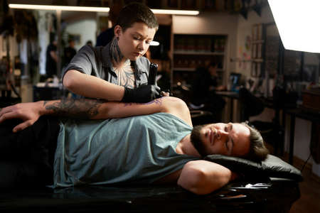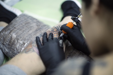 Tattoo artist doing tattoo in tatoo salon.