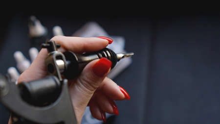 Female hand with red nails holding tattoo machine. Hand without gloves - practice and training tattoo. Dark background