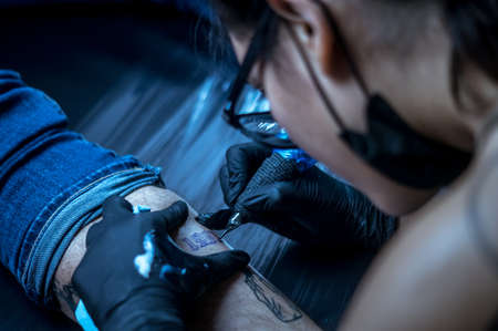 Professional female tattoo artist makes a tattoo in the studio, close-up. Dark photography
