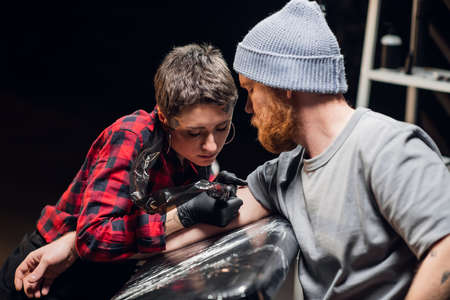 An experienced tattoo artist gives a tattoo to a white scandinavian hipster man with a red beard in his tattoo parlor