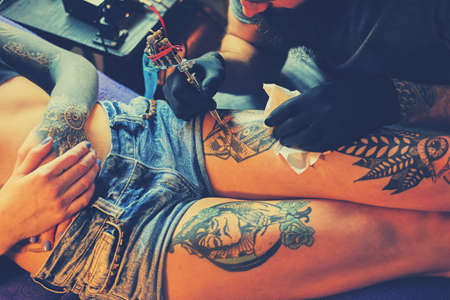 Close up image of the bearded tattoo male artist makes a tattoo on a female leg.