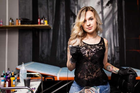 Young woman tattoo artist in a tattoo shop