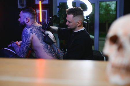 Tattoo master make tattoo for rocker man at tattoo salon