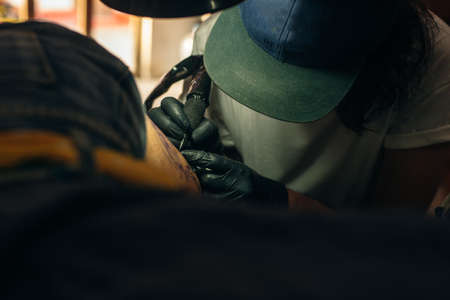 Close up image of the tattoo artist makes a tattoo on a man arm.