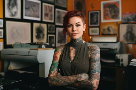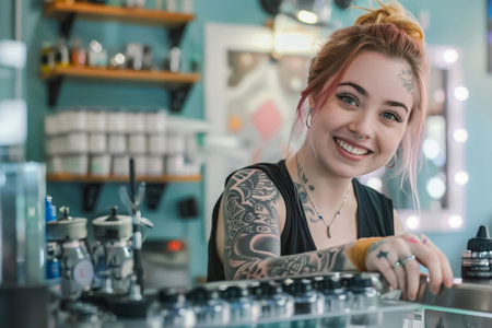 A tattooed woman with piercings smiling in a tattoo studio, showcasing self-expression, individuality, and modern culture. High quality photo