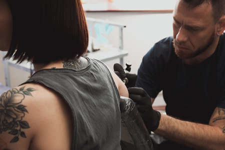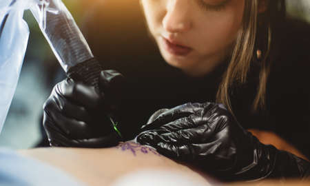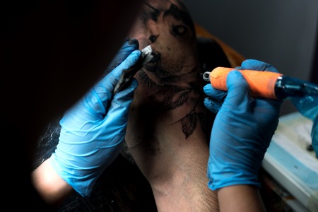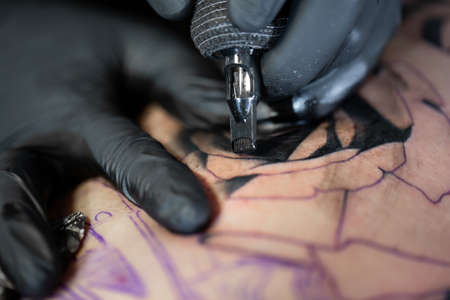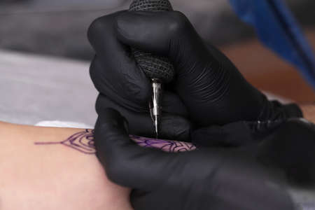 tattoo master artist makes a tattoo. Closeup