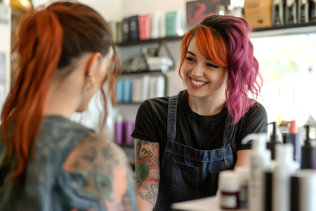 Hairdresser with colorful hair and tattoos warmly consulting a client at a modern hair salon, providing professional advice