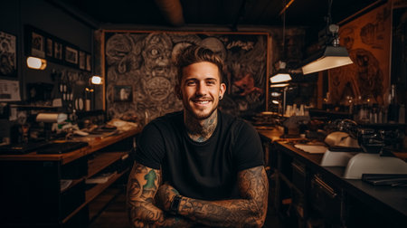 Portrait of a handsome tattooed male barber standing in a cafe