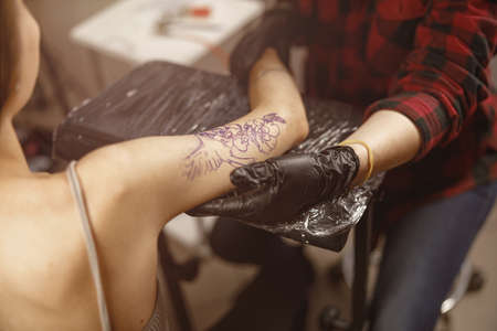 Close up of a tattoo artist holding an iron pen and making a new design on the arm of a young woman at the shop