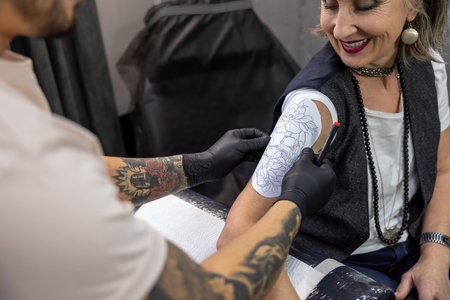 Tattoo master applying a tattoo sketch on the womans shoulder
