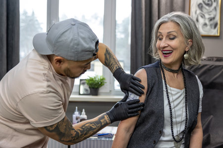 Senior woman tattoo artist wearing gloves in a tattoo shop