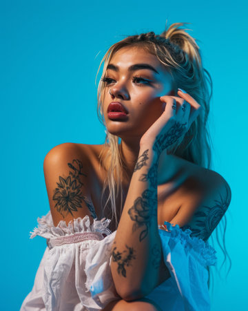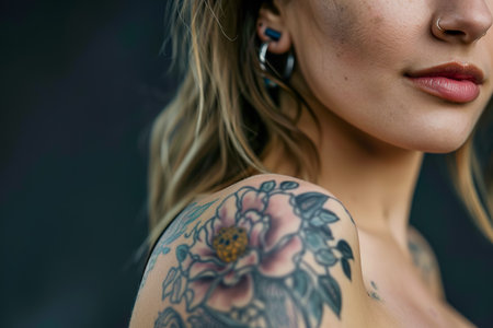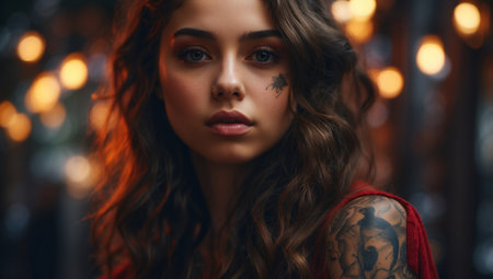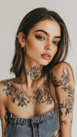 Close-up portrait of a beautiful young woman with tattoos on her arms and chest