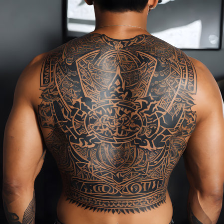 A man's back adorned with a colorful and intricate traditional Japanese tattoo, symbolizing artistry and tradition