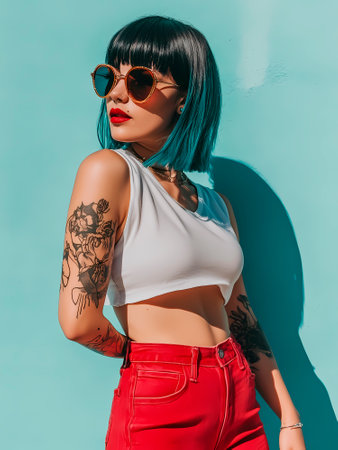 AI-Generated image of A woman with blue hair and red lips stands in front of a blue wall. She is wearing a white tank top and red pants