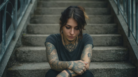 Young caucasian female with tattoos sitting on stairs in thoughtful pose.