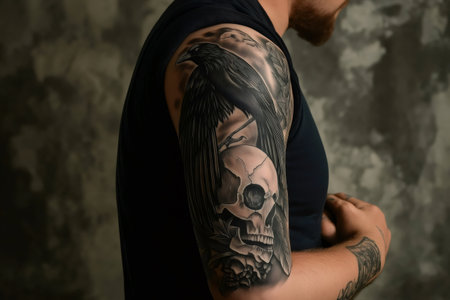 Tattoo artist presenting a striking black and gray tattoo featuring a raven elegantly perched on a skull, highlighting intricate details