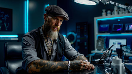 A tattoo artist works meticulously in a low-light studio, holding a tattoo machine with ink-stained hands, showcasing the artistry involved in body art.