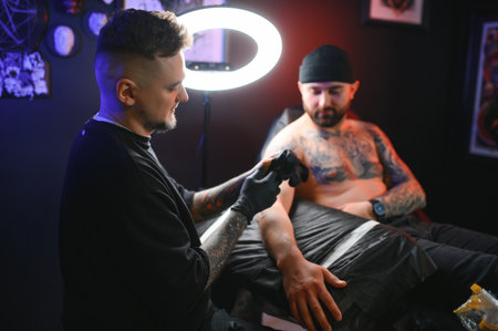 Tattoo master make tattoo for rocker man at tattoo salon