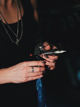 female artist prepares tools and machine for tattoo session, holding a tattoo gun. The tattooist checks the machine for performance