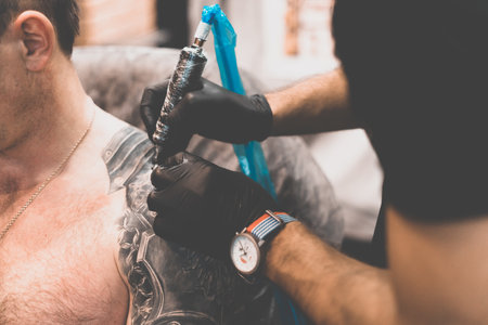 Tattoo salon. The tattoo master is tattooing a man on his shoulder. Tattoo machine, safety and hygiene at work. Close-up, tinted, tattooist