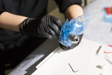 Professional tattooist working on professional tattoo machine gun in tattoo studio