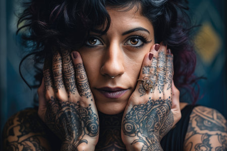 Portrait of a woman with piercing eyes and intricate henna tattoos on her hands, set against a textured background