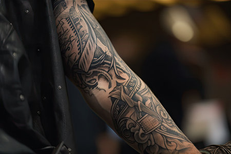 close-up of cowboys arm, with intricate blackwork tattoo in the foreground, created with generative ai